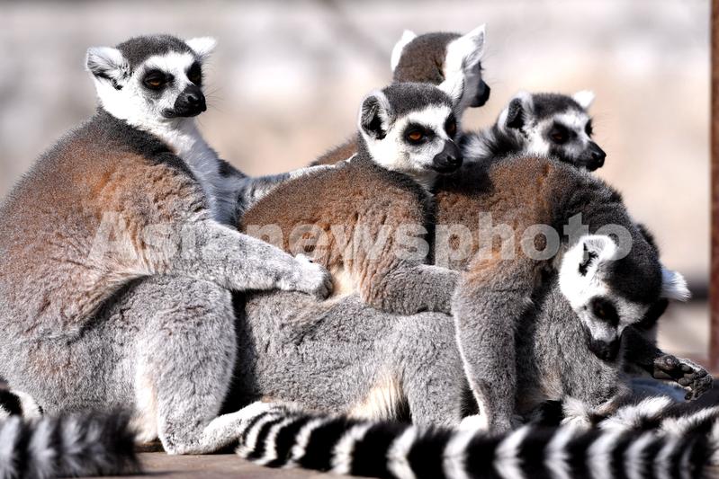 2021年11月18日,山东青岛森林野生动物世界,环尾狐猴聚在一起取暖。