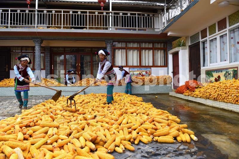 2021年11月16日,云南省大理州巍山县五印乡新民村委会别落古村彝族群众在家里晾晒玉米。初冬时节,云南省大理白族自治州巍山彝族回族自治县18万亩玉米喜获丰收,当地农民抢抓农时节令,抓紧收获晾晒金黄色的玉米,乡村一派丰收繁忙的喜人景象。近年来,巍山县党建引领粮食产业发展,积极调整农业种植结构,全面推进高标准农田建设,保障粮食生产安全,促进粮食增产农民增收。