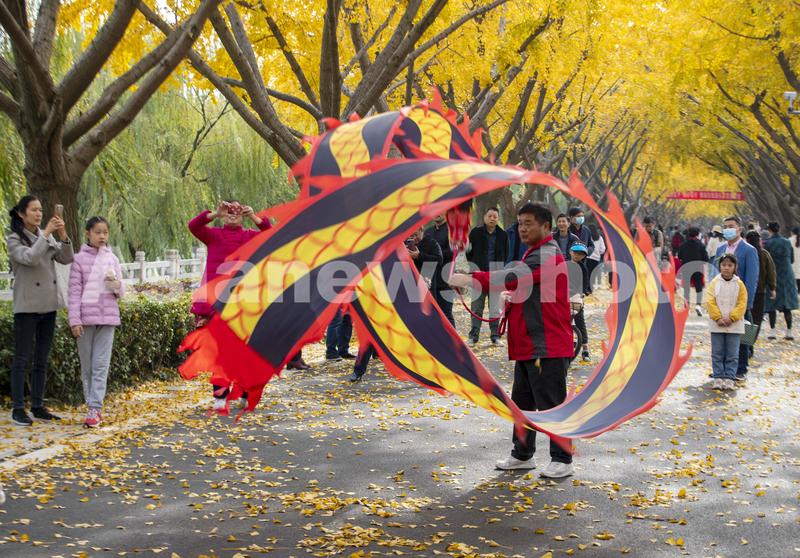 2021年11月20日,游客在江苏省扬州市江都水利枢纽风景区的“银杏大道”进行健身舞龙表演。