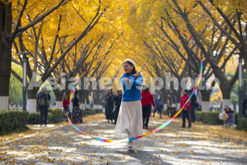 2021年11月20日,游客在江苏省扬州市江都水利枢纽风景区的“银杏大道”进行彩带表演。