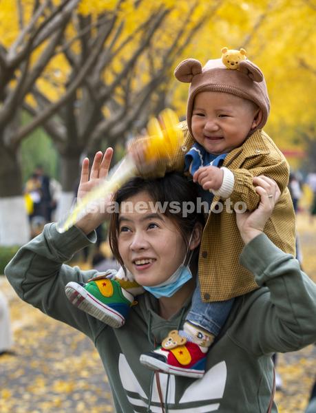 2021年11月20日,游客在江苏省扬州市江都水利枢纽风景区的“银杏大道”游玩。