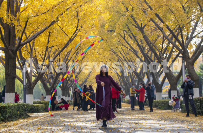 2021年11月20日,游客在江苏省扬州市江都水利枢纽风景区的“银杏大道”进行彩带表演。