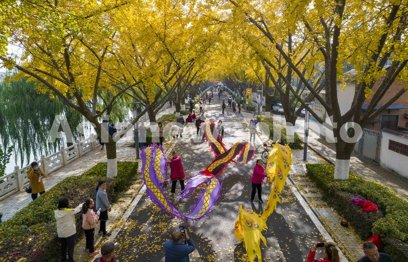 2021年11月20日,游客在江苏省扬州市江都水利枢纽风景区的“银杏大道”进行健身舞龙表演(无人机照片)。
