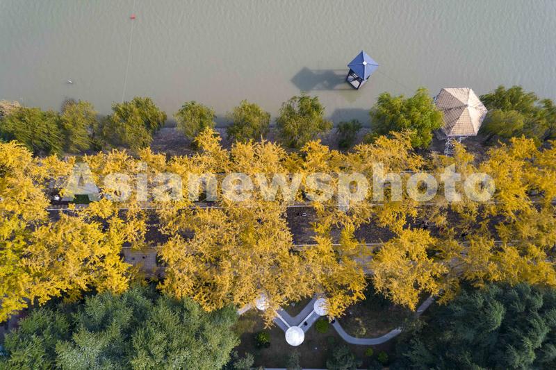 2021年11月20日,拍摄的江苏省扬州市江都水利枢纽风景区的“银杏大道”景色(无人机照片)。