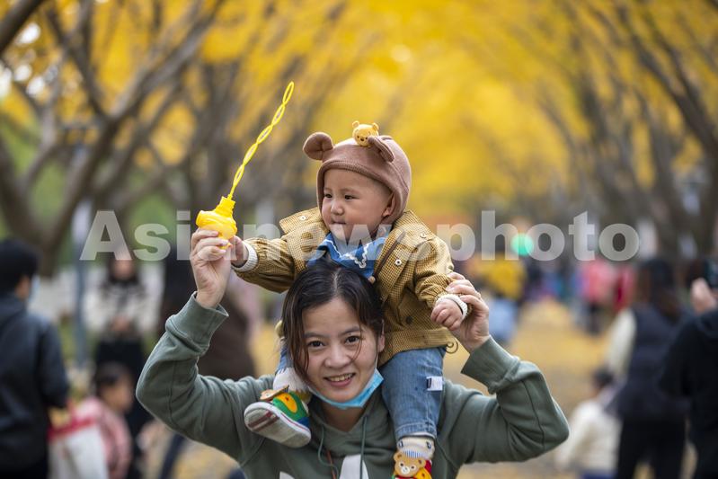 2021年11月20日,游客在江苏省扬州市江都水利枢纽风景区的“银杏大道”游玩。