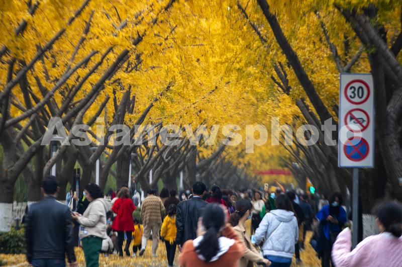 2021年11月20日,游客在江苏省扬州市江都水利枢纽风景区的“银杏大道”游玩。
