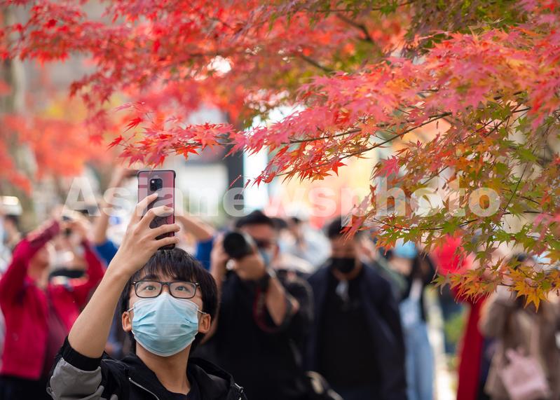 2021年11月20日,初冬时节,南京栖霞山风景区层林尽染,景色如画,景区内的红叶树种进入最佳观赏期,吸引不少游人前来观赏。