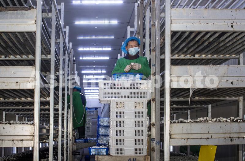 图片说明:2021年11月21日,扬州奥吉特生物科技有限公司的工人正在采收双孢菇。