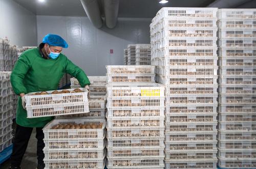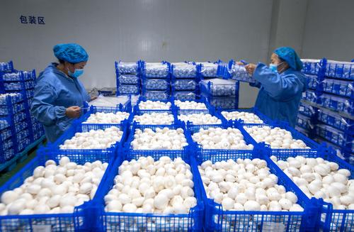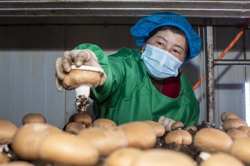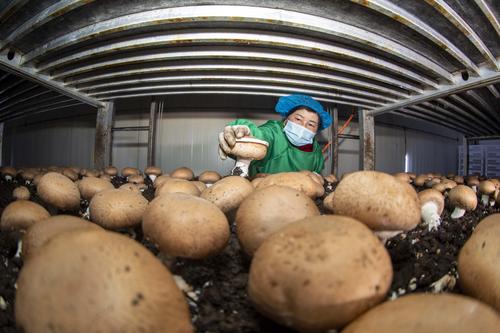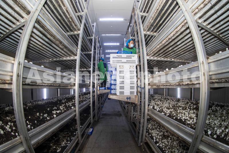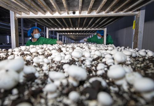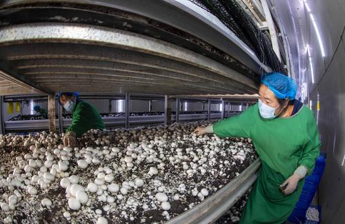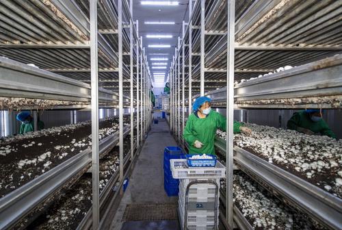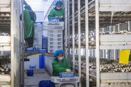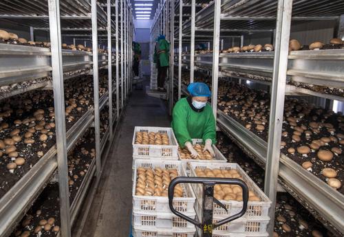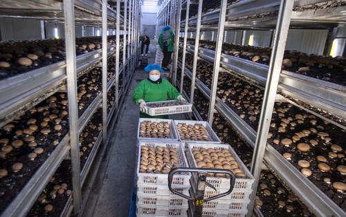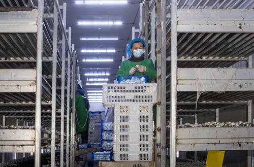 图片说明:2021年11月21日,扬州奥吉特生物科技有限公司的工人正在采收双孢菇。