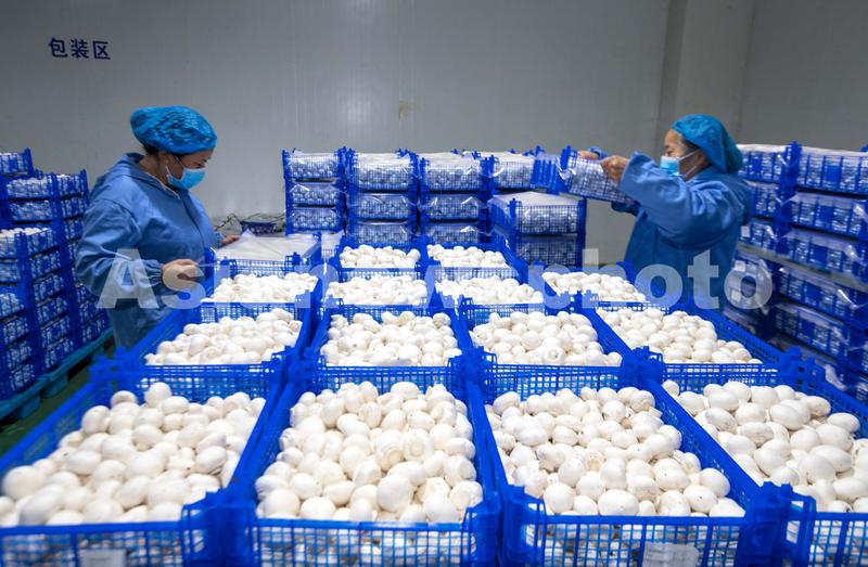 图片说明:2021年11月21日,扬州奥吉特生物科技有限公司的工人将采收的双孢菇成品进行分级包装。