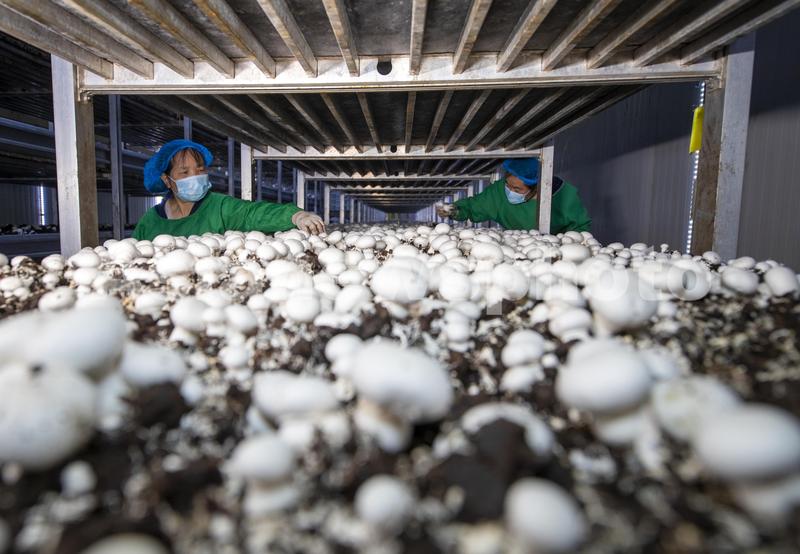 图片说明:2021年11月21日,扬州奥吉特生物科技有限公司的工人正在采收双孢菇。