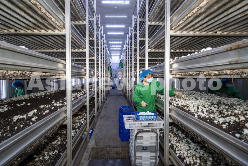 图片说明:2021年11月21日,扬州奥吉特生物科技有限公司的工人正在采收双孢菇。