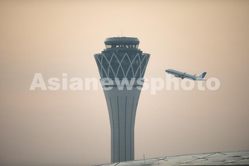 图片说明:2021年11月19日,在海口美兰国际机场,一架飞机从新塔台旁边飞过。
