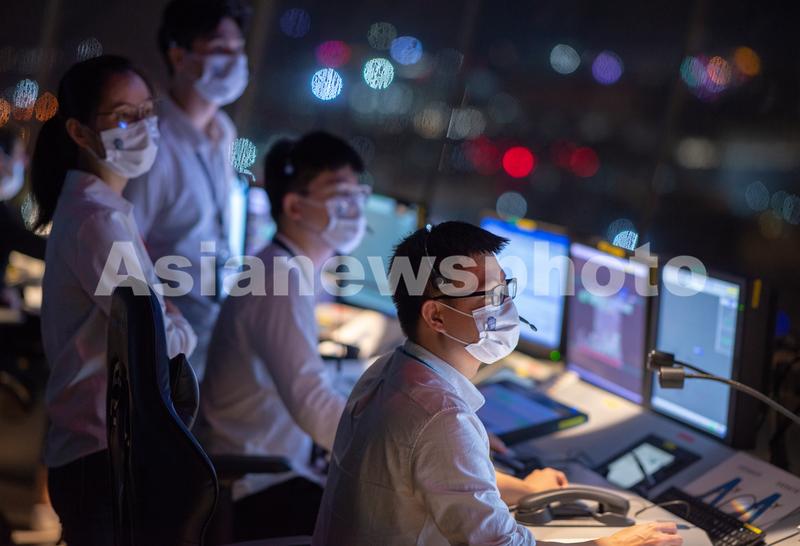 图片说明:2021年11月19日晚,在海口美兰国际机场新塔台,空中交通管制员在进行管制指挥。