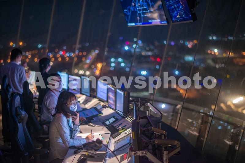 图片说明:2021年11月19日晚,在海口美兰国际机场新塔台,空中交通管制员在进行管制指挥。