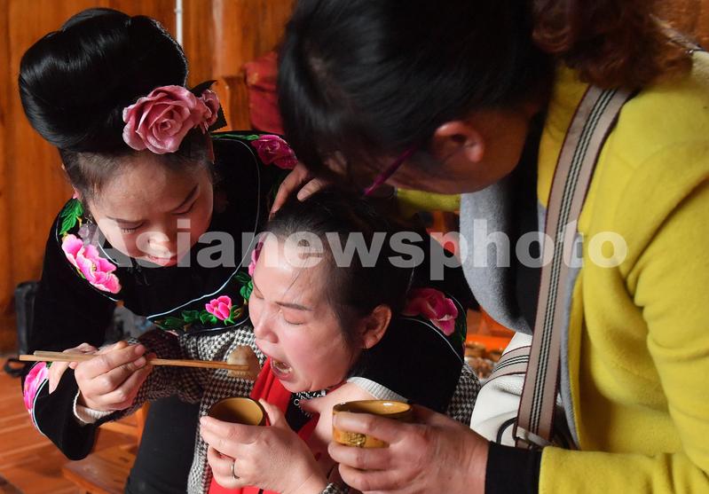 图片说明:11月13日,贵州省黔东南苗族侗族自治州雷山县郎德镇乌流村一苗族村民在给客人敬肥肉。