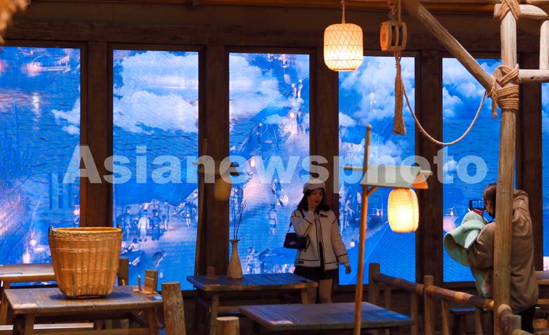 2021年11月13日,上海,瑞虹天地太阳宫商场内近期开设的古风武侠主题美食街“江湖-城市集市”人气十足,成为北外滩室内网红打卡街区。墙壁屏幕上演绎着动态清明上河图等古人生活情景。