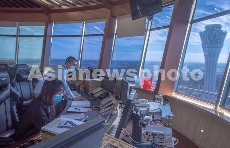 图片说明:2021年11月20日上午8时许,在海口美兰国际机场旧塔台,空中交通管制员张婉娴(左一)和段佳炅在配合新塔台进行管制指挥。
