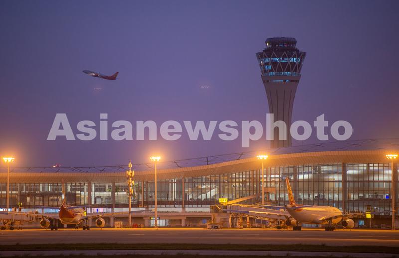 图片说明:2021年11月19日晚,在海口美兰国际机场,一架飞机从新塔台旁边飞过。