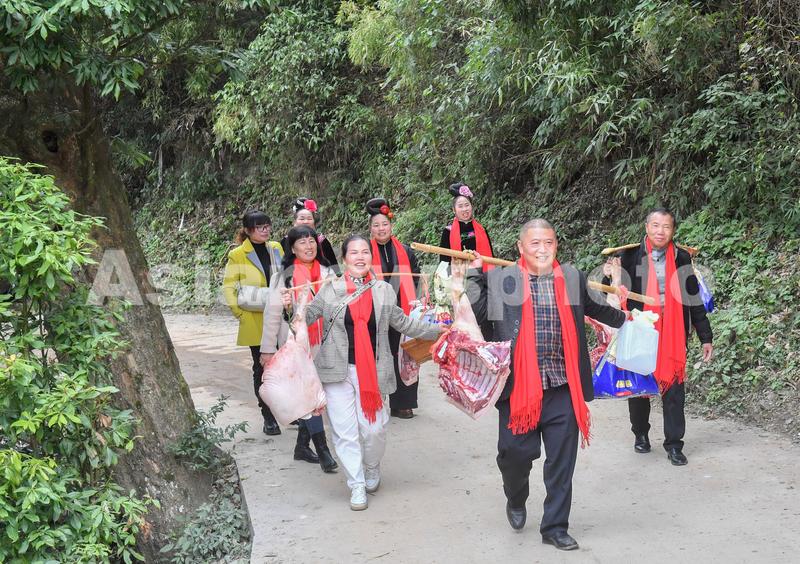图片说明:11月13日,贵州省黔东南苗族侗族自治州雷山县郎德镇乌流村,客人们挑着主人家送的猪腿等礼物走在返家的路上。