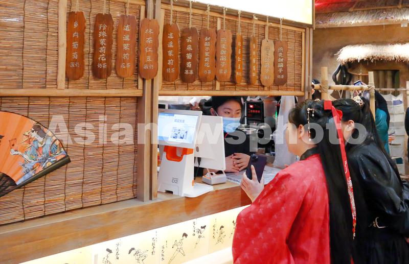 2021年11月13日,上海,古风武侠主题美食街“江湖-城市集市”成为北外滩新晋网红打卡街区。消费者穿应景汉服逛古代街巷。