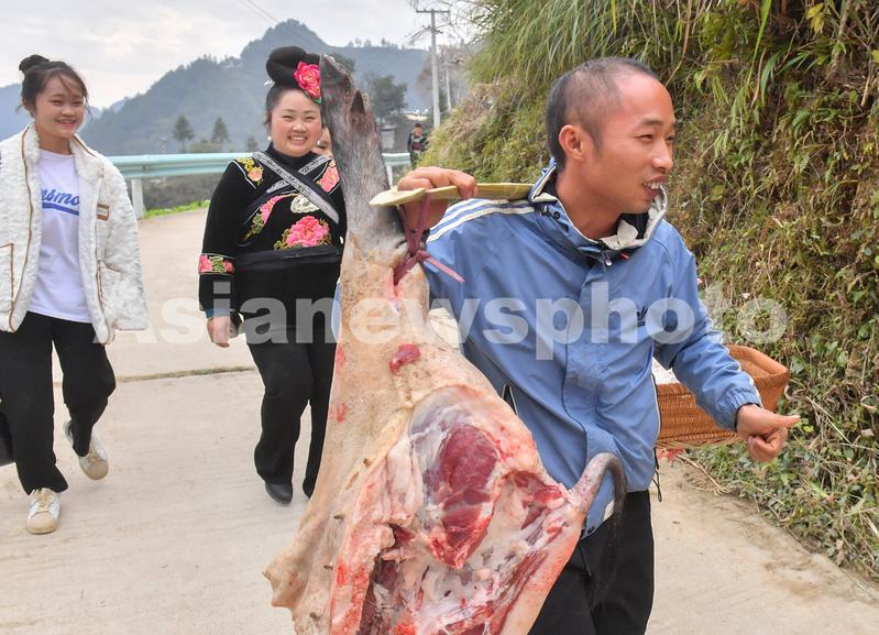 图片说明:11月13日,贵州省黔东南苗族侗族自治州雷山县郎德镇乌流村,客人们挑着主人家送的猪腿等礼物走在返家的路上。