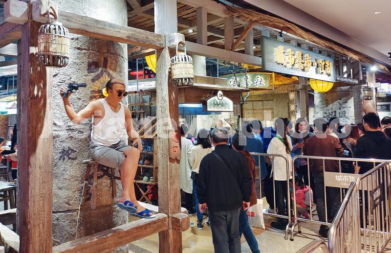 2021年11月13日,上海,古风武侠主题美食街“江湖-城市集市”还原了中国内地和香港影视作品的经典场景和角色,成为北外滩新晋网红打卡街区。周星驰电影《功夫》中的火云邪神逼真模型。