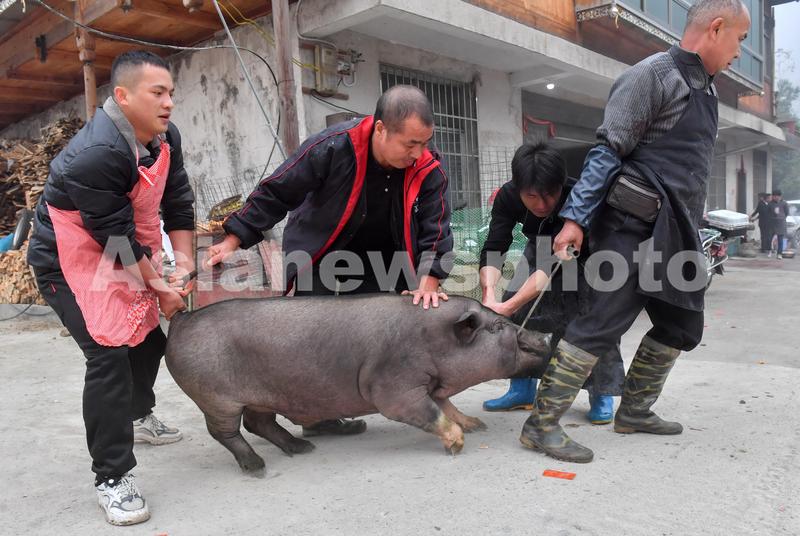 图片说明:11月13日,贵州省黔东南苗族侗族自治州雷山县郎德镇乌流村一村民家在新房前拖猪准备宰杀款待亲朋好友。