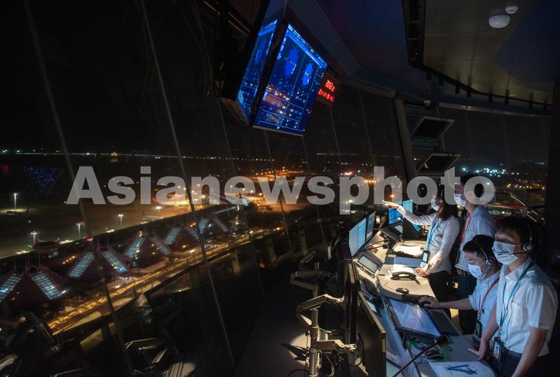 图片说明:2021年11月19日晚,在海口美兰国际机场新塔台,空中交通管制员在进行管制指挥。