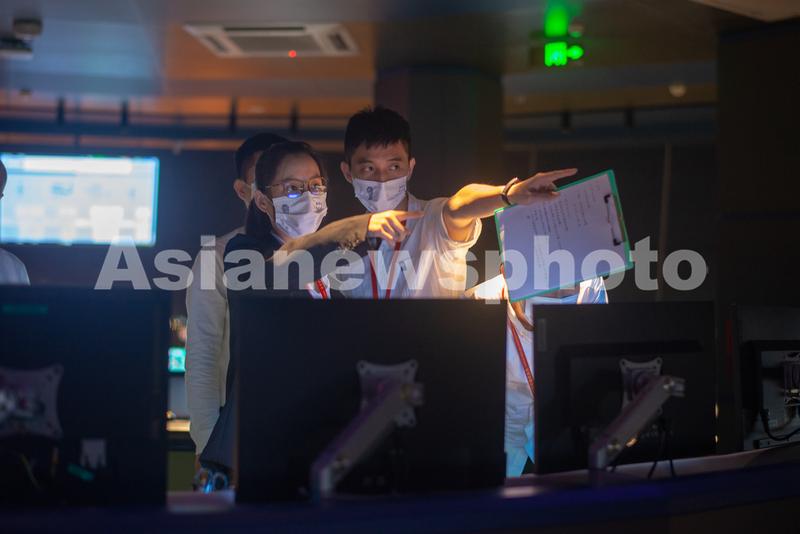 图片说明:2021年11月19日晚,在海口美兰国际机场新塔台,空中交通管制员在进行管制指挥时,紧盯着塔台窗外不断起降的民航客机,遇到问题就随时交流。