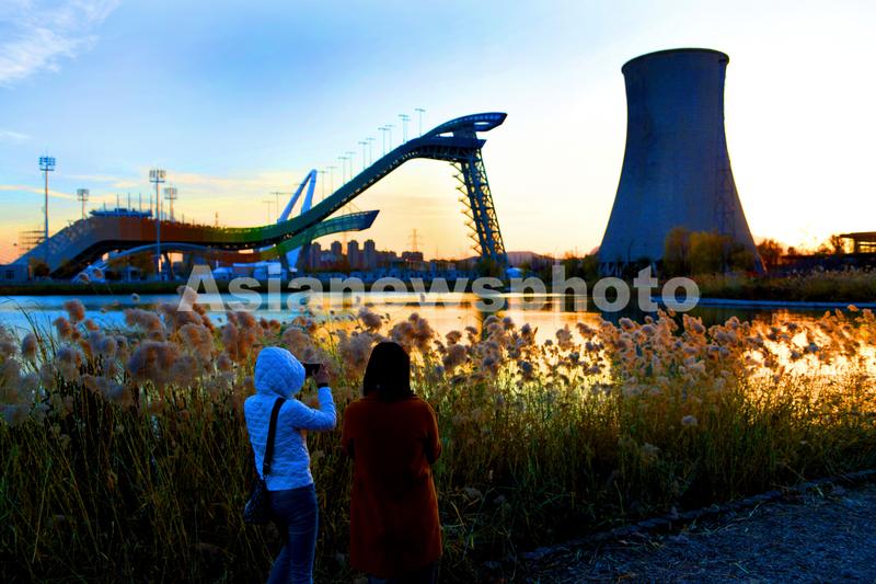 图片说明:11月13日,在北京首钢园滑雪大跳台旁,游人赏景拍照。