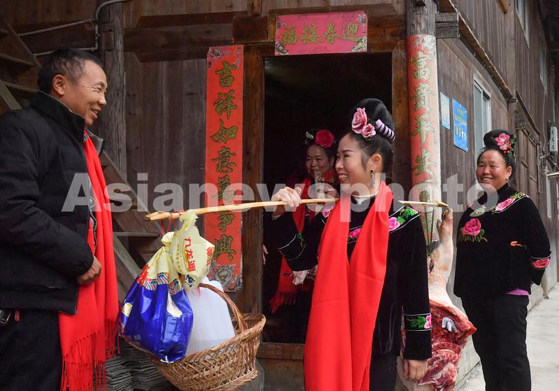 图片说明:11月13日,贵州省黔东南苗族侗族自治州雷山县郎德镇乌流村,客人们挑着主人家送的猪腿等礼物离开主人家。