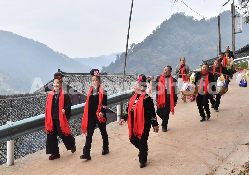 图片说明:11月13日,贵州省黔东南苗族侗族自治州雷山县郎德镇乌流村,客人们挑着主人家送的猪腿等礼物走在返家的路上。