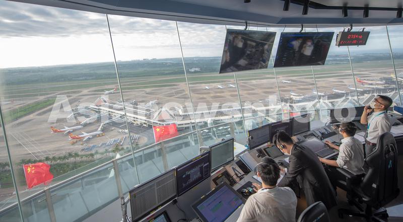 图片说明:2021年11月20日上午7时许,在海口美兰国际机场新塔台,空中交通管制员指挥飞机有序起飞。