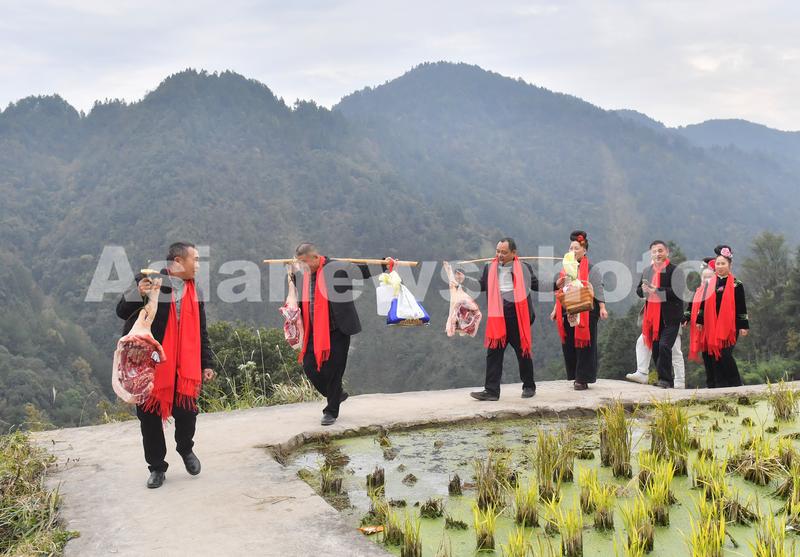 图片说明:11月13日,贵州省黔东南苗族侗族自治州雷山县郎德镇乌流村,客人们挑着主人家送的猪腿等礼物走在返家的路上。