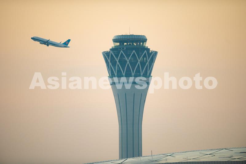 图片说明:2021年11月19日,在海口美兰国际机场,一架飞机从新塔台旁边飞过。
