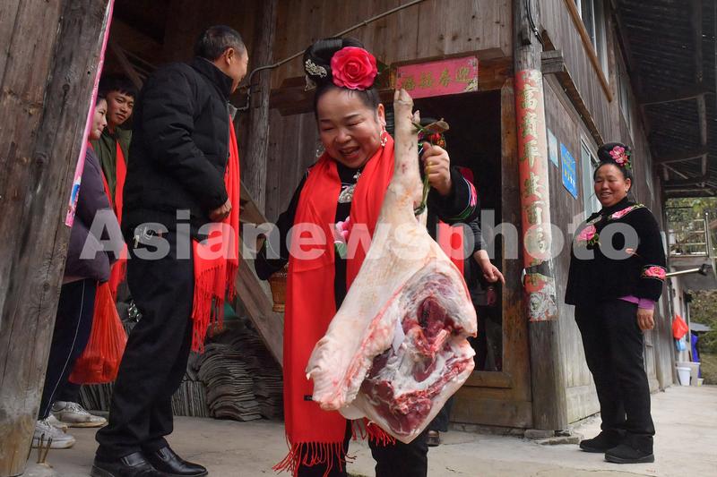 图片说明:11月13日,贵州省黔东南苗族侗族自治州雷山县郎德镇乌流村,客人们挑着主人家送的猪腿等礼物离开主人家。