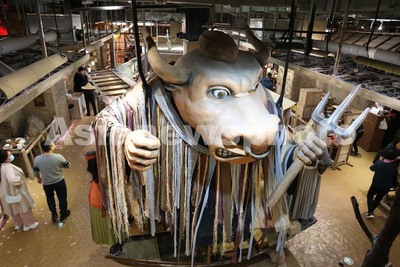 2021年11月13日,上海,古风武侠主题美食街“江湖-城市集市”成为北外滩新晋网红打卡街区。魔幻牛魔王逼真模型。
