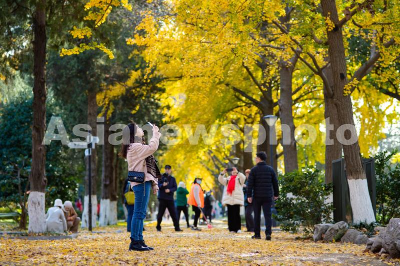 图片说明:11月22日,游人在南京玄武湖公园银杏树下拍照。