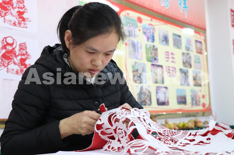 图片说明:2021年11月18日,河北省邯郸市广平县广平小学美术教师郭俊芝在创作“喜迎冬奥会”剪纸作品。