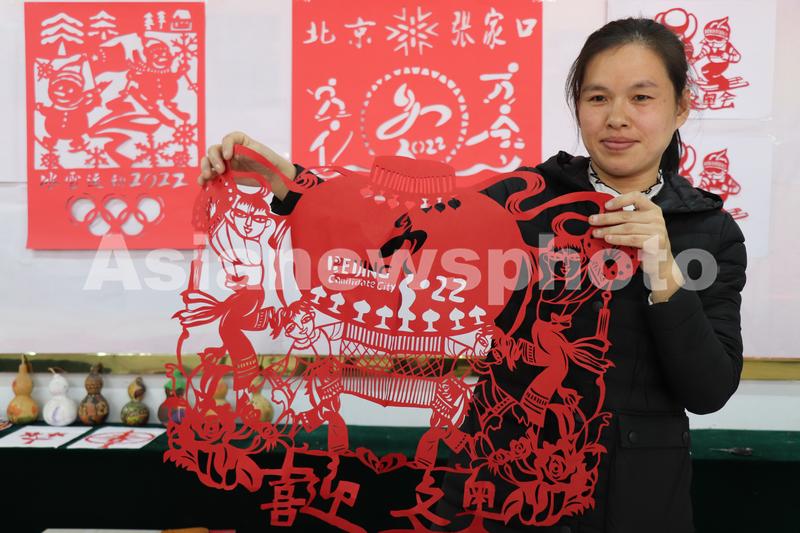 图片说明:2021年11月18日,河北省邯郸市广平县广平小学美术教师郭俊芝在展示创作的“喜迎冬奥会”剪纸作品。
