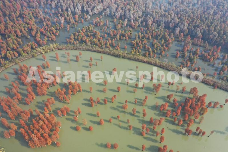 2021年11月18日,在江苏省南京市航拍的池杉湖湿地公园冬景。