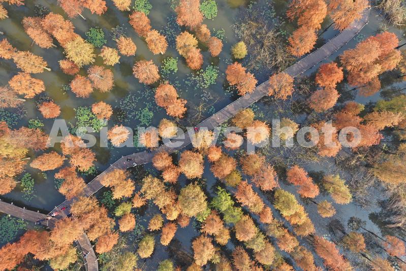 2021年11月18日,江苏省南京市池杉湖湿地公园色彩斑斓,呈现出一幅美丽的生态画卷。池杉湖湿地公园位于江苏省南京市六合区与安徽省滁州市来安县交界处,总占地面积5800亩,其中江苏片区3600亩。