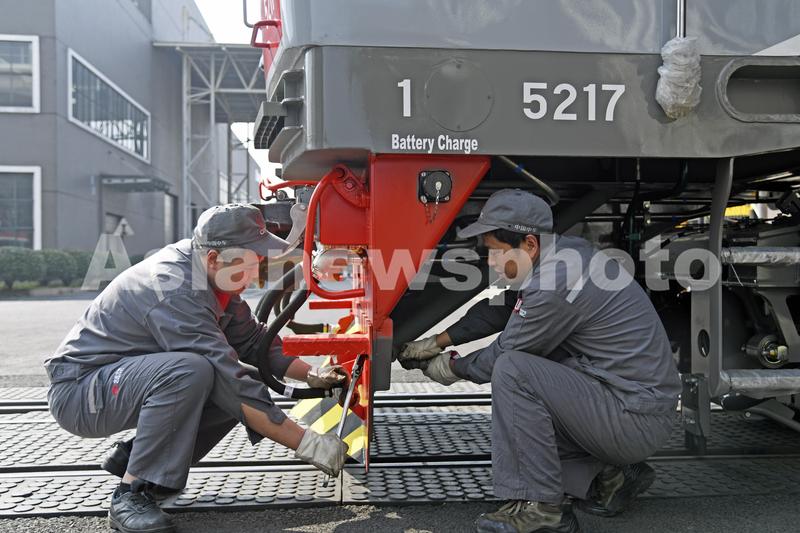 2021年11月18日,位于常州市经开区中车戚墅堰机车有限公司厂区内,工人们正在对出口泰国50台内燃机车进行最后的检查和调试工作。