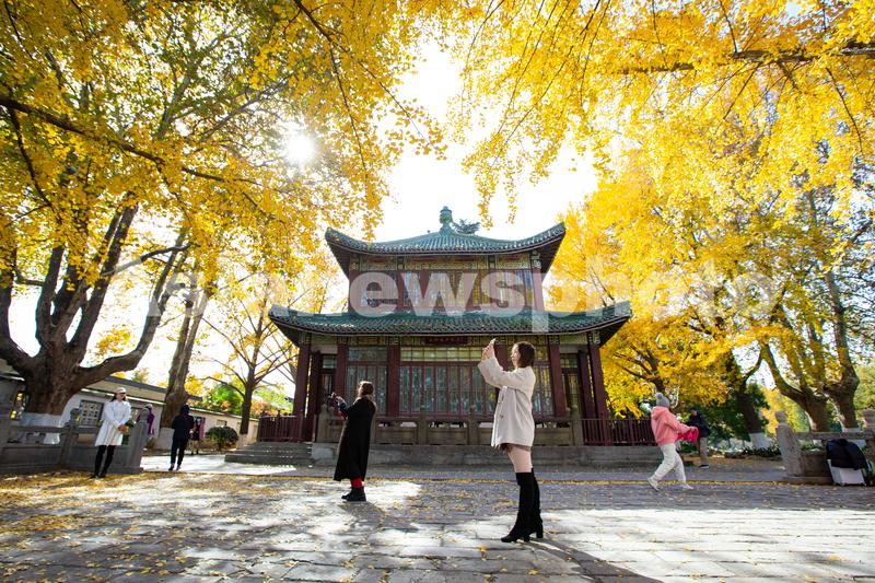 图片说明:11月22日,游人在南京玄武湖公园银杏树下拍照。