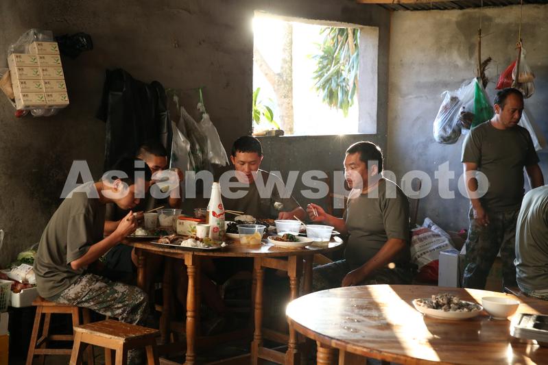 11月17日,执勤民兵在瑞丽江边一处边境疫情防控值守点吃晚饭。