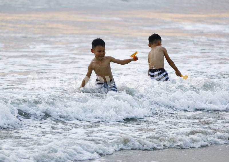 2021年11月25日,海南三亚,2名小朋友在三亚湾海边玩耍。“小雪”节气过后,我国北方多地迎来降温天气,而在我国南方的海南三亚暖冬如春,气候宜人,人们纷纷到海边,乐享初冬时光。