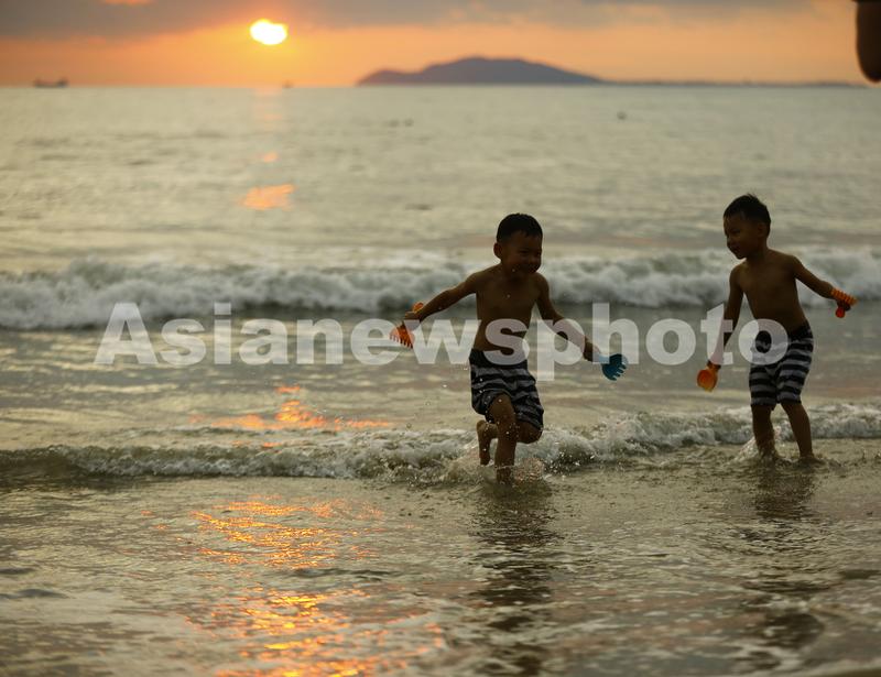 2021年11月25日,海南三亚,2名小朋友在三亚湾海边玩耍。“小雪”节气过后,我国北方多地迎来降温天气,而在我国南方的海南三亚暖冬如春,气候宜人,人们纷纷到海边,乐享初冬时光。