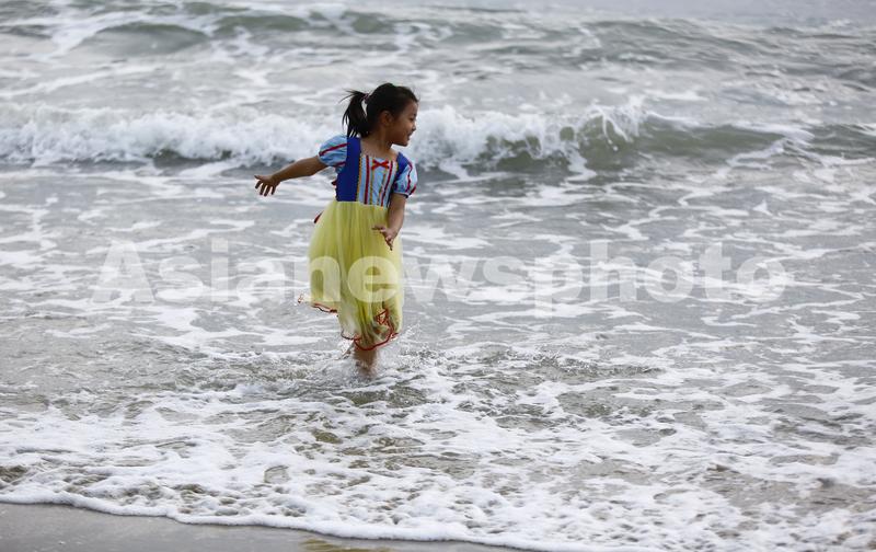 2021年11月25日,海南三亚,一小朋友在三亚湾海边玩耍。