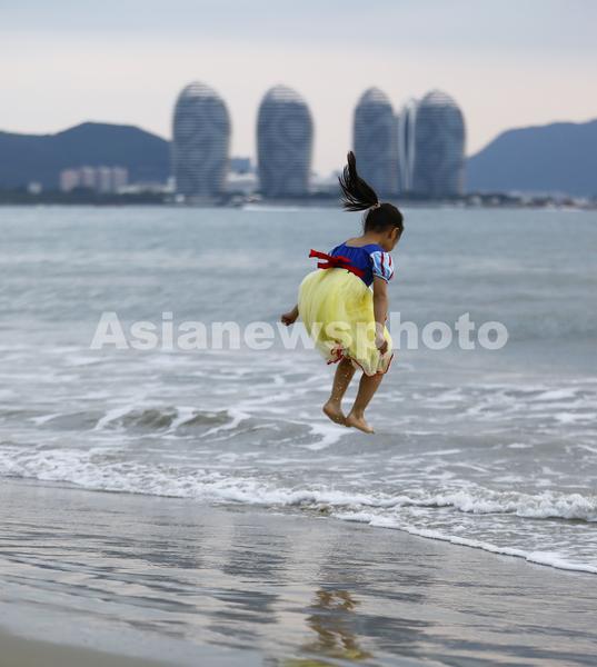 2021年11月25日,海南三亚,一小朋友在三亚湾海边玩耍。